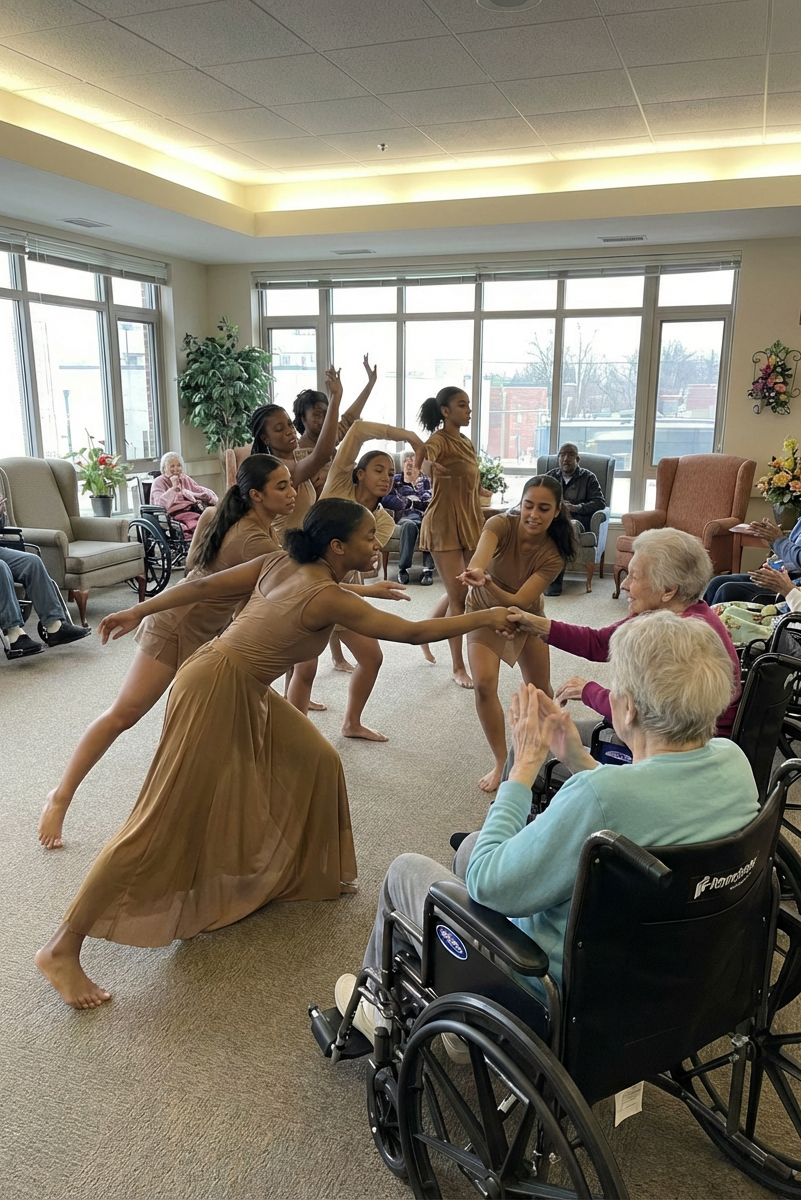 - CARES Community Joy Project – Through our CARES Community Joy Project, we bring uplifting performances, donations, and human connection to homeless shelters, nursing homes, hospitals, and underserved neighborhoods. Our dancers give back through service-driven events, holiday drives, and healing arts experiences designed to bring joy, dignity, and presence to individuals often overlooked.